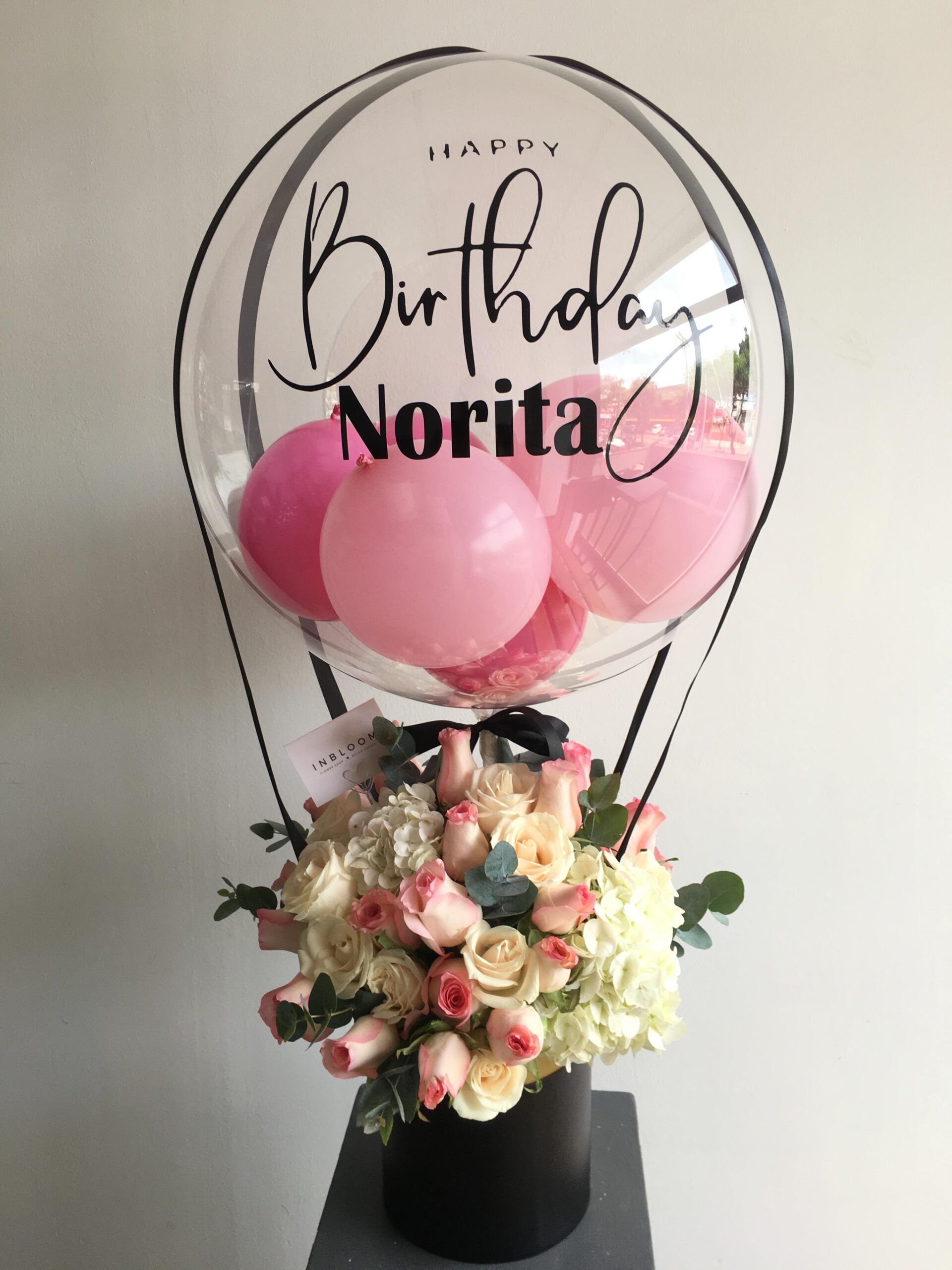 Arreglo floral de hortensias y rosas con globo burbuja personalizado