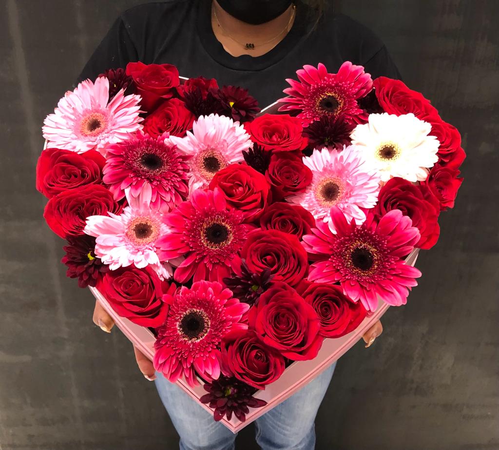 Caja en forma de corazon con rosas, gerberas y shasta